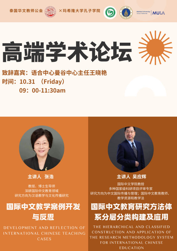 (泰华通讯记者协会讯)为推动泰国本土中文教师教学水平提升,促进国际中文教育领域的交流与发展,泰国华文教师公会联合玛希隆大学孔子学院将于2025年10月30日至31日邀请北京语言大学专家在曼谷时代中学举办“泰国本土中文教师培训及面向国际中文教育的专家讲座”系列活动,本次活动采用线下讲座与线上同步直播相结合的方式进行,培训期间不收取任何费用并提供免费午餐,按规定完成培训后可领取培训证书。